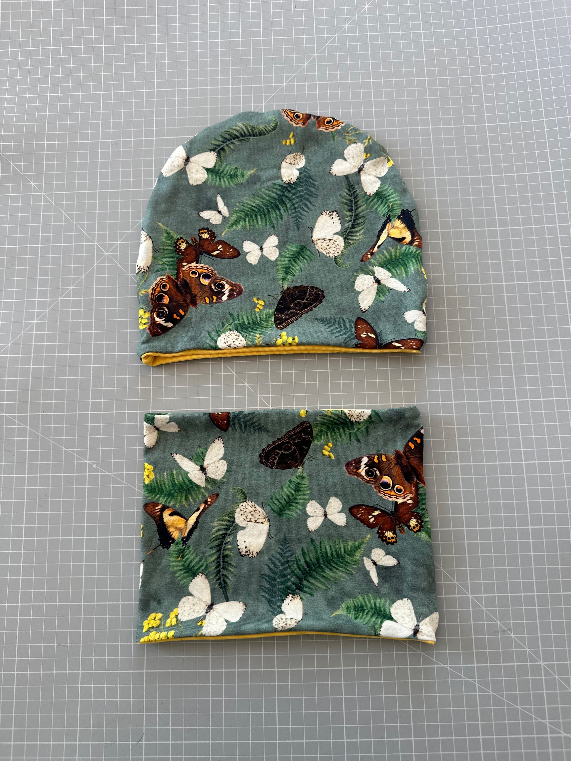 Cappello e scaldacollo bambina fatto a mano in maniera artigianale, in jersey di cotone certificato Oeko Tex- 95% cotone, 5 % elastane.