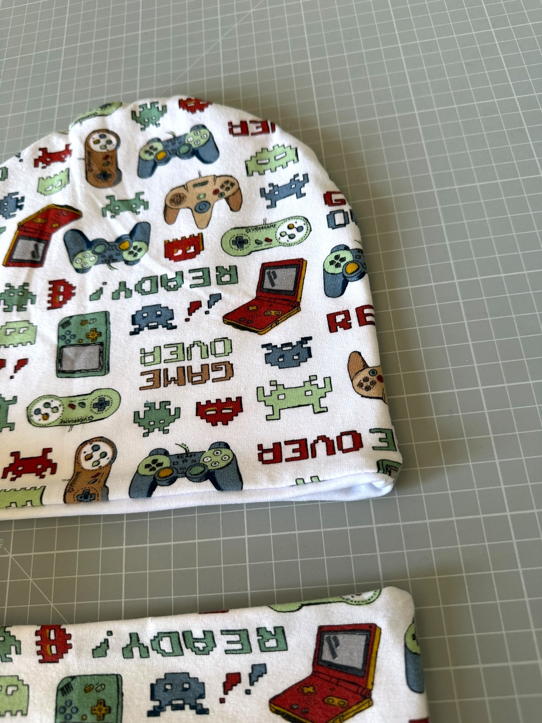 Cappello e scaldacollo bambino fatto a mano in maniera artigianale, in jersey di cotone certificato Oeko Tex- 95% cotone, 5 % elastane.