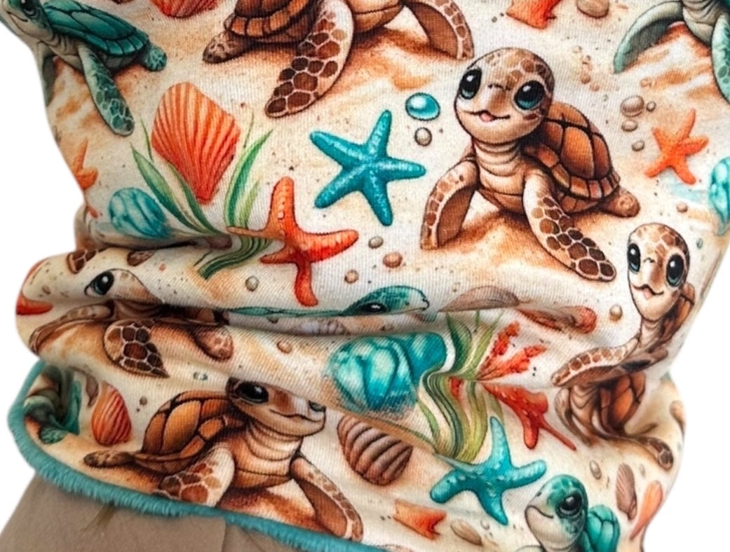 Set cappello e scaldacollo fatto a mano in cotone certificato, con una simpatica fantasia di tartarughe colorate. Morbido, sicuro e confortevole, è adatto sia ai maschietti che alle femminucce. Un accessorio unico e artigianale, ideale per proteggere i bambini con stile e allegria.