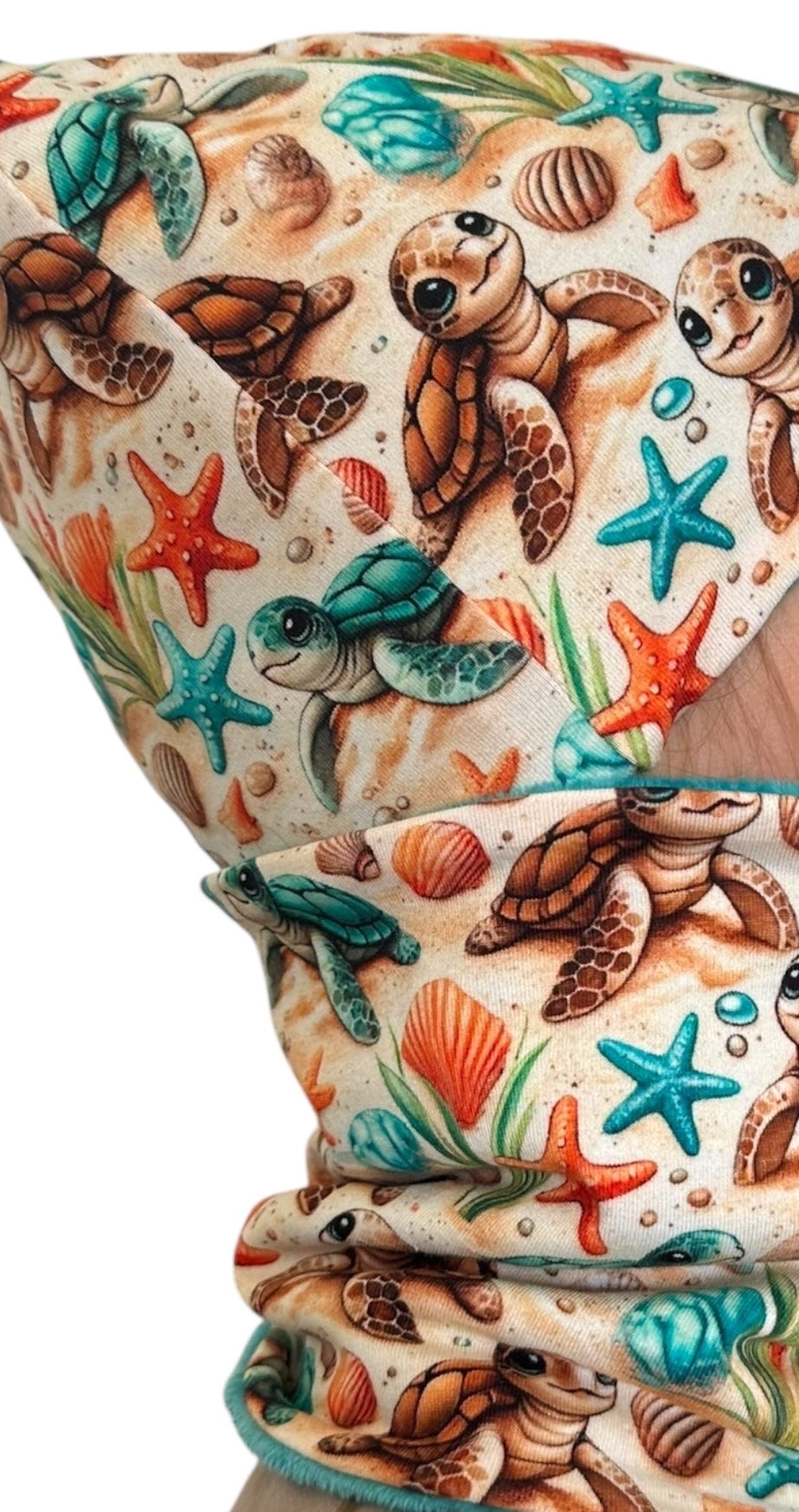 Set cappello e scaldacollo fatto a mano in cotone certificato fantasia tartarughe